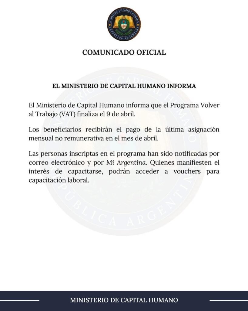 La decisión impacta directamente sobre el programa Volver al Trabajo, la reconversión del ex Potenciar Trabajo, y marca el cierre definitivo de ese esquema de asistencia.